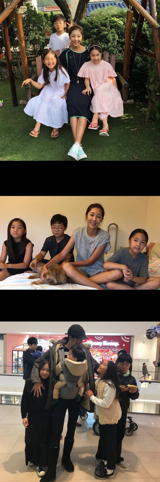 공개된 사진 속 전미라는 아들 윤라익 군, 딸 윤라임, 윤라오 양과 함께 카메라를 응시하며 환하게 웃고 있다.