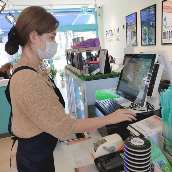 공개된 사진 속 율희는 마스크를 낀 채 포스기를 만지고 있다. 머리를 묶어 단정함이 느껴진다.