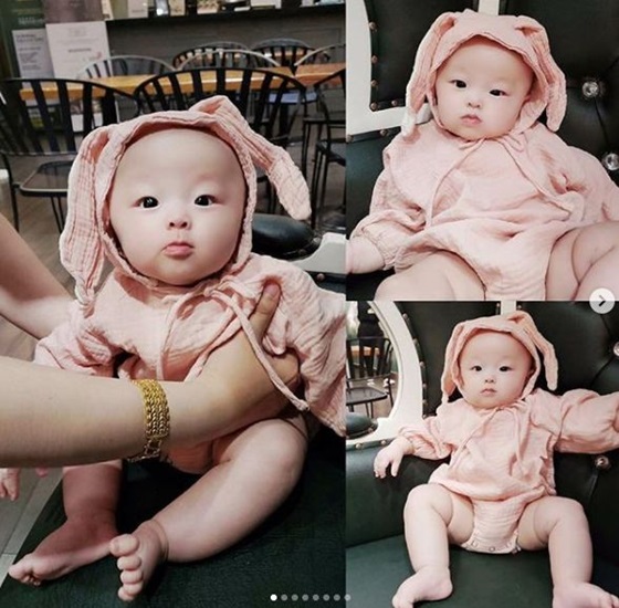 공개된 사진에는 분홍색 토끼 옷을 입은 황금보 군의 모습이 담겨 있다. 사진 속 황금보 군은 카메라를 향해 귀엽고 깜찍한 외모를 뽐내며 시선을 사로잡고 있다.