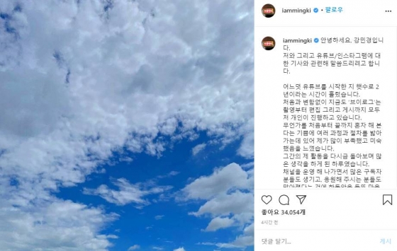 먼저 강민경은 이날 자신의 인스타그램에 "어느덧 유튜브를 시작한 지 햇수로 2년이라는 시간이 흘렀다. 처음과 변함없이 지금도 '브이로그'는 촬영부터 편집 그리고 게시까지 모두 저 개인이 진행하고 있다"며 "무언가를 처음부터 끝까지 혼자 해 본다는 기쁨에 여러 과정과 절차를 밟아가는데 있어 제가 많이 부족했고 미숙했음을 느꼈다"며 장문의 글을 썼다.
