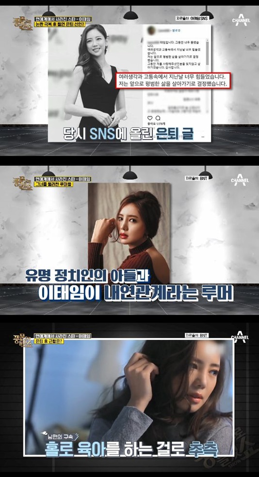 지난 20일 방송된 채널A '풍문으로 들었쇼'에서는 '연예계에서 사라진 스타'라는 주제로 돌연 은퇴를 선언해 충격을 안긴 이태임의 근황을 전했다.
