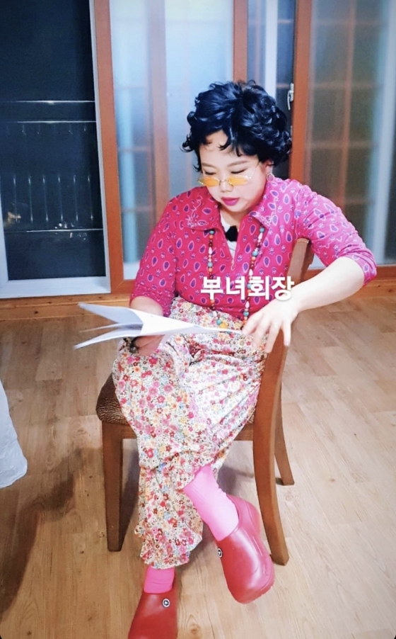 사진 속 홍현희는 꽃무늬 상·하의를 갖춰 입은 채 무언가를 보고 있다. 뽀글머리와 구슬 목걸이는 '부녀회장룩'에 정점을 찍는다. 어떤 촬영을 위해 갖춰입은 건지 궁금증을 자아낸다.