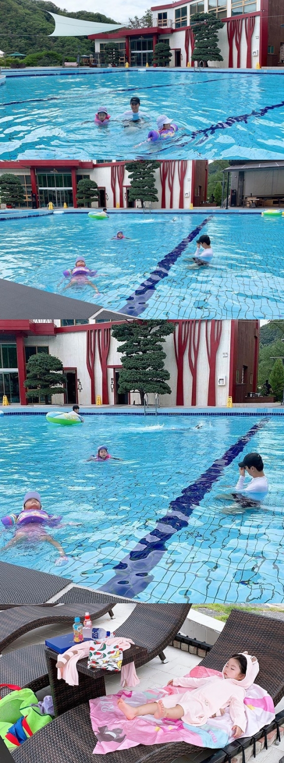 공개된 사진 속에는 배우 인교진과 딸 하은, 소은 양이 물놀이를 즐기고 있다. 물놀이 후 선베드에 누워 자는 모습이 귀여움을 유발한다.