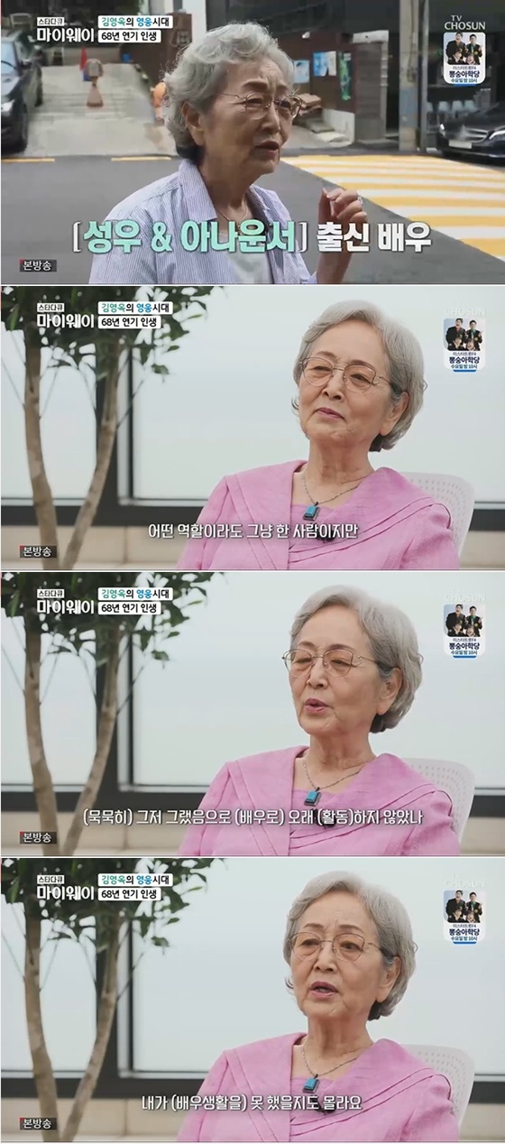이날 방송에서 김영옥은 "그 어떤 역할이라도 그냥 한 사람이지만, 그저 그래서 오래 하지 않았나 싶다"라고 털어놨다. 그는 "배우라면 다 주인공, 예쁜 역할 하고 싶을 것이다. 난 그런 생각은 안했던 것 같다. 내가 '김혜자 씨 역할 할 수 있는데'라고 했다면 지금 이렇게까지 배우 생활을 못 했을 것 같다"라며 자신의 소신을 밝혔다. 이어 "주어진 것에 순응하고, 열심히 해 오늘까지 오지 않았나 싶다"라고 덧붙였다.