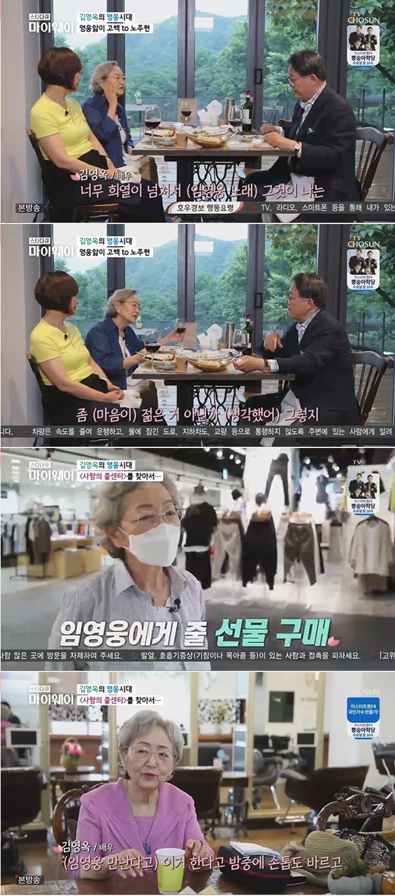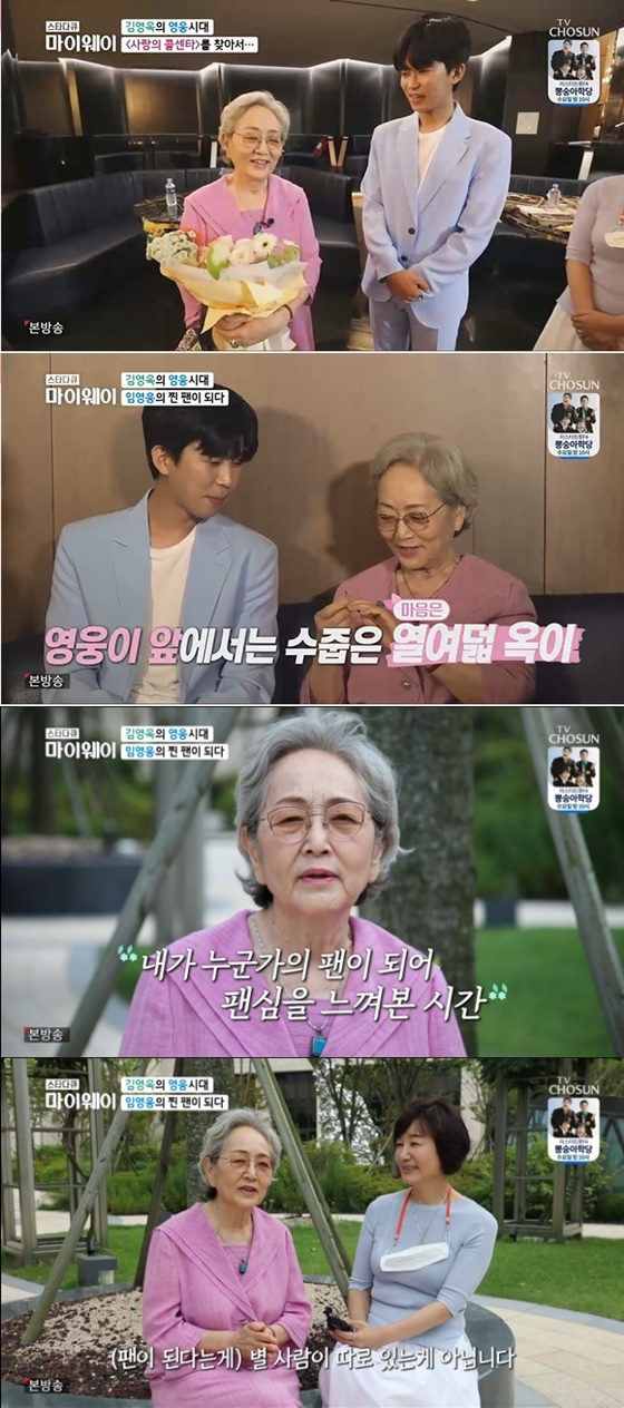 김영옥은 '마이웨이'의 내레이션을 맡은 김혜영과 노주현과 만났다. 김영옥은 노주현의 칭찬을 하다 임영웅의 이야기로 흘러갔다. 노주현 역시 "정말 잘했어"라며 임영웅을 칭찬했다. 김영옥은 미소를 감추지 못하며 "정말 다 매력 있어. 우리 매니저는 지겨울 것이다"라고 말했다. 알고 보니 김영옥은 이동 중 늘 임영웅의 노래를 듣고, 불렀던 것. 김영옥의 매니저는 "선생님 덕분에 음악을 좋아하고 있다"고 했다.