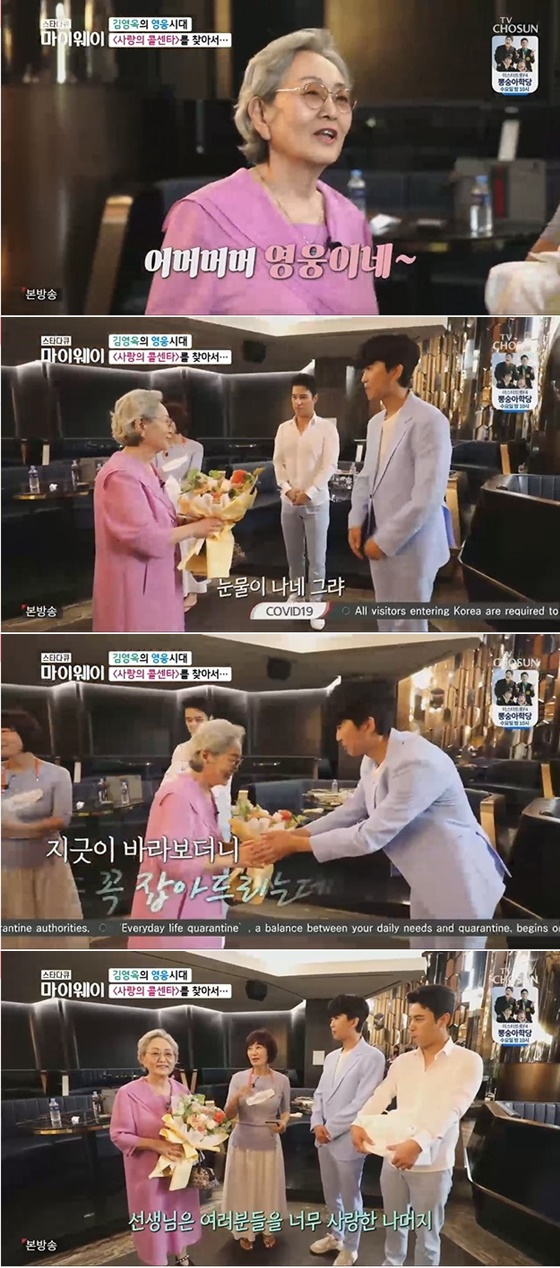 이후 김영옥은 김혜영과 함께 '신청곡을 불러드립니다- 사랑의 콜센타(이하 사랑의 콜센타)' 녹화장을 찾았다. 바로 '미스터 트롯' TOP 6를 만나기 위한 것. 김영옥은 꽃다발을 들고 등장한 임영웅과 대면했다. 꽃다발을 건넨 임영웅에게 "무슨 꽃을 줘. 되려 내가 받으면 어쩌나. 눈물이 나네 그려. 말이 안 나와"라고 말했다. 이어 "좋아라"라고 기쁜 마음을 드러냈다. 또 김영옥은 "녹화 하느라 너무 힘든 후 일 것 같아 오래 볼 수가 없다. 결례를 하는 거다. 실제로 예쁜 사람들을 봐서 죽겠다"라고 전했다.