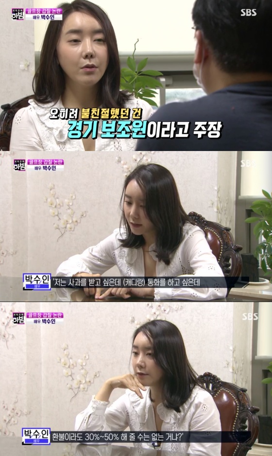 박수인은 골프장 환불 소문에 대해서도 해명했다. 박수인은 '본격연예 한밤'과의 인터뷰에서 "무시를 당했다는 생각에 잠이 안 오더라. 골프장에 전화해서 캐디에게 사과를 받고 싶다고 했다. 그러나 캐디와 연결해줄 수 없다고 했다. 그래서 환불이라도 30~50% 해 줄 수는 없는 거냐고 했는데 거절당했다"고 말했다.