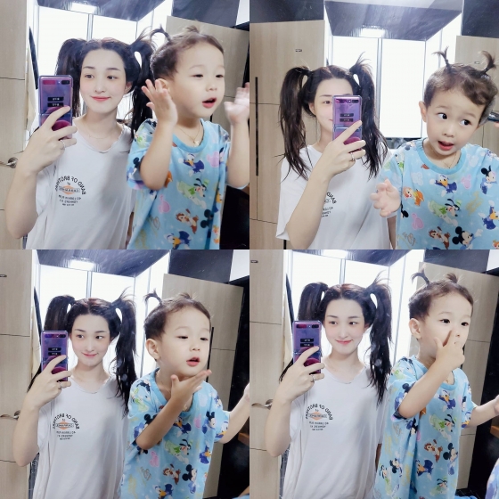 공개된 사진 속 율희는 재율 군과 함께 거울 샷을 찍고 있다. 서로 똑같은 양 갈래 머리를 하고 환하게 미소 짓고 있는 모습이 귀여움을 자아낸다.