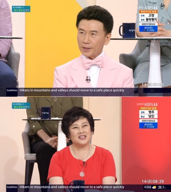 14일 오전 방송된 KBS 1TV 교양프로그램 '아침마당'에서는 코너 '생생토크-만약 나라면'으로 꾸며져 '이 나이에 참고 살아 VS 말아'를 주제로 황혼이혼에 대한 이야기를 나눴다. 강진 김효선 부부, 왕종근 김미숙 부부, 배우 남능미, 코미디언 이상해, 최병서 등이 출연했다.
