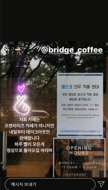 29일 오후 진태현은 자신의 인스타그램 스토리에 "저희 카페는 프렌차이즈 카페가 아니지만, 내일부터 테이크아웃만 판매합니다. 하루빨리 모든 게 정상으로 돌아오길 바라며"라는 글과 함께 사진을 게재했다.