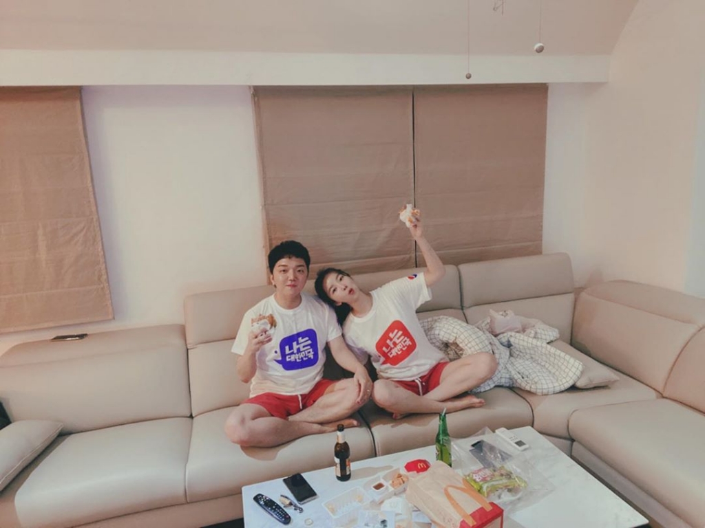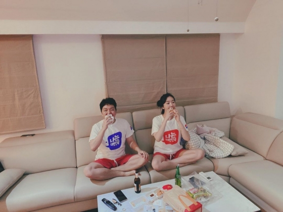 공개된 사진 속에는 배슬기와 심리섭이 커플티를 맞춰입은 채 거실에서 햄버거를 먹고 있는 편안한 모습이 담겨 있었다.