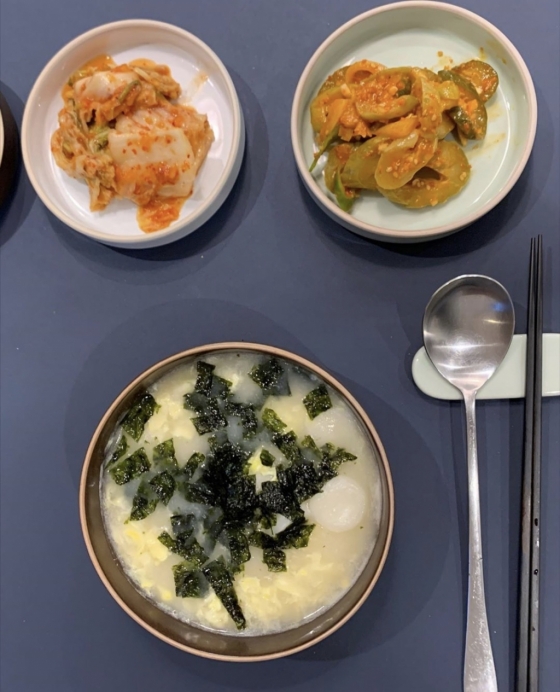 이연희는 다른 사진에서 떡국, 오이장아찌, 김치 등으로 차린 밥상을 올리며 깔끔하게 차려진 한 끼를 보여줬다.
