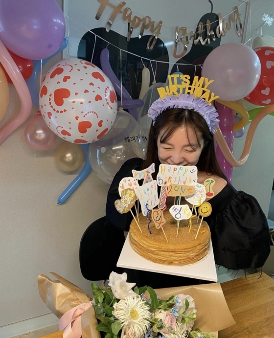 사진 속 김성은은 지인이 준비한 걸로 추정되는 케이크를 들고 행복해하고 있다.