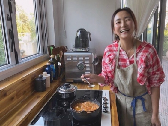 공개된 사진 속 진재영은 앞치마를 입고 환하게 웃고 있다. 주방에서 찌개를 끓이는 모습으로 소탈한 매력을 보였다.