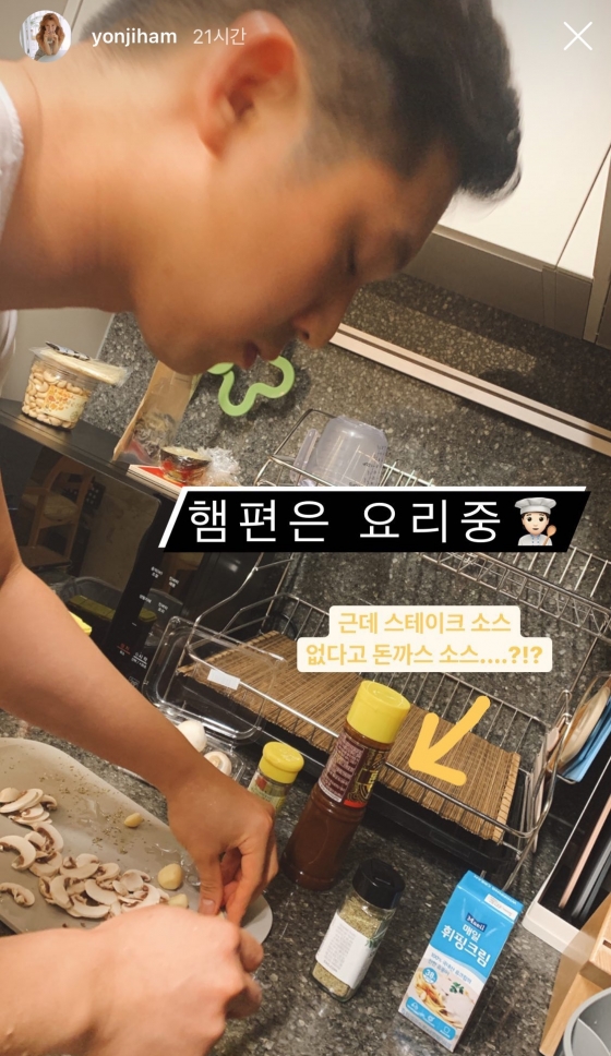 공개된 사진 속에는 열심히 요리를 하고 있는 함연지 남편의 모습이 담겨있다. 함연지는 "햄편은 요리 중"이라는 글을 남겼다.