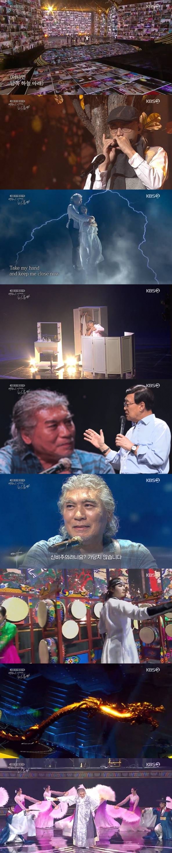 나훈아는 자신의 폭발적인 에너지를 역대급 스케일과 퍼포먼스로 쏟아냈다. 그는 무대 위 첫 등장에서 배를 타고 등장하는가 하면, 와이어줄을 타고 무대 위를 날아올라 관객들을 놀라게 했다. 무대에 기차, 천사, 용 CG, 폭발하는 코로나 CG가 등장하는가 하면 오케스트라, 국악단 연주, 어린이 합창단, 부채춤, 줄타기, 하프 연주 등 장르 초월의 쉴틈 없는 퍼포먼스가 펼쳐졌다.