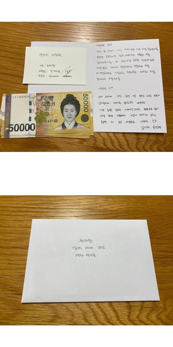 공개된 사진에는 진태현, 박다비다가 박시은에게 전하는 편지와 용돈, '설거지 15회권' 쿠폰이 담겨 있다. 특히 편지에는 진태현과 딸 박다비다가 박시은을 향한 애정 넘치는 마음이 담겨 눈길을 끌었다.