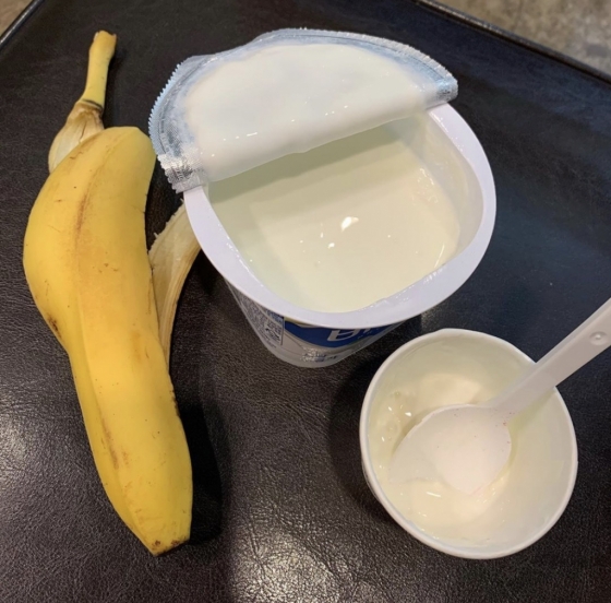 사진 속에는 박미선의 저녁 식단인 요플레와 바나나 1개가 놓여있다. 한 끼 식사로 보기에는 터무니없이 부족한 양이다.
