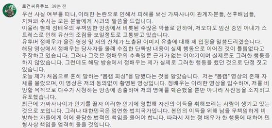 이어 "오늘 제가 처음으로 흔히 말하는 '몸캠 피싱'을 당했다는 것을 알았습니다"면서 "저는 '몸캠' 영상의 존재 자체를 몰랐으며, 이 영상은 저의 동의없이 촬영된 영상입니다"고 덧붙였다.