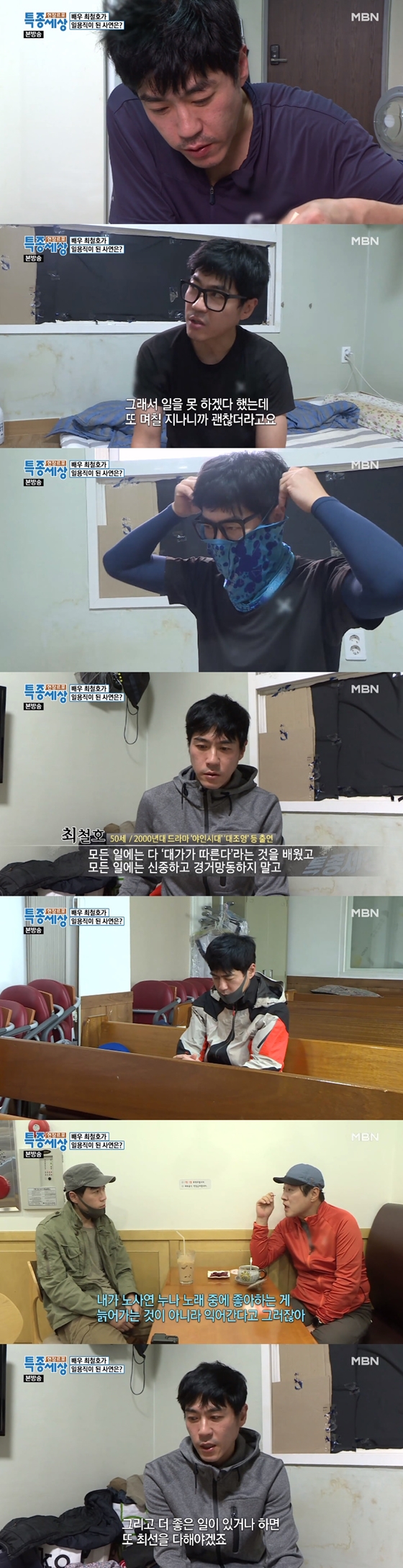 밤샘 작업을 마치고 퇴근하는 최철호는 5평 남짓 원룸에서 룸메이트와 지내고 있었다. 그는 퇴근 후 인스턴트 밥, 편의점에서 사온 찌개가 주식이었다. 과거 굵직한 드라마에 출연하며 인기를 모았던, 화려한 모습과는 사뭇 달랐다.
