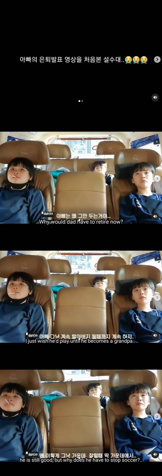 이동국의 아내 이수진 씨는 26일 자신의 인스타그램에 "학교 끝나고 차에 타서 아빠의 은퇴 소식을 처음 알리고 은퇴 발표 영상을 함께 보면서 어린 아이들의 느낌은 어떨까 내심 궁금했는데 이렇게 폭풍오열을 할줄이야"라며 영상을 게재했다.