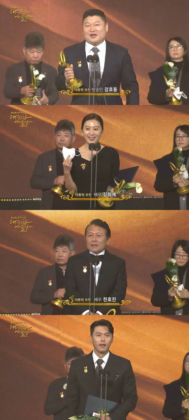 배우 김희애, 천호진, 현빈, 방송인 강호동이 '2020 대한민국 대중문화예술상' 대통령 표창을 수상했다.