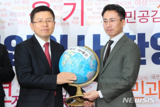 사진기자 출신 탐험가 남영호 대장이 13일 서울 여의도 국회 본관에서 열린 2020 자유한국당(현 국민의힘) 영입인사 환영식에서 황교안 전 대표에게 지구본을 선물하고 있다. /사진=뉴시스