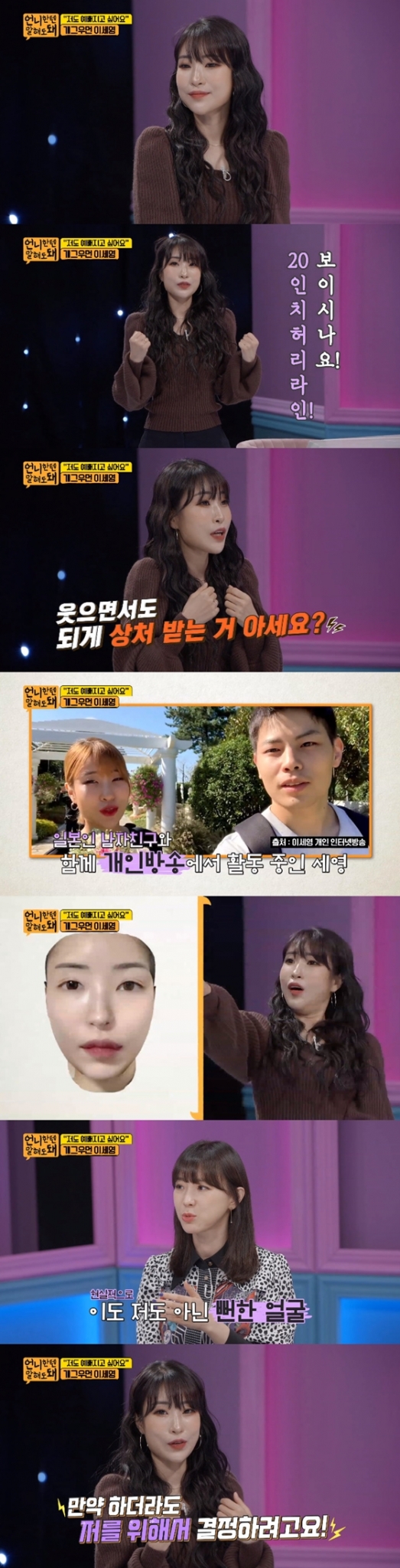 지난 26일 방송된 SBS플러스 '언니한텐 말해도 돼'에서는 '성형하면 예뻐지나요?'라는 사연이 소개됐다. 사연의 주인공은 '개그맨'으로 활동했던 이세영이었다.
