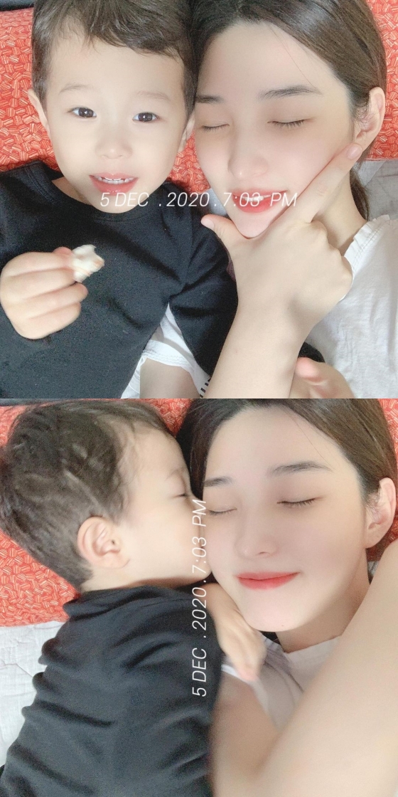 공개된 사진 속 율희는 첫째 최재율 군과 함께 누워 사진을 찍고 있다. 재율 군은 고사리손에 간식을 쥐고 웃으며 카메라를 응시해 귀여운 모습을 보였다.