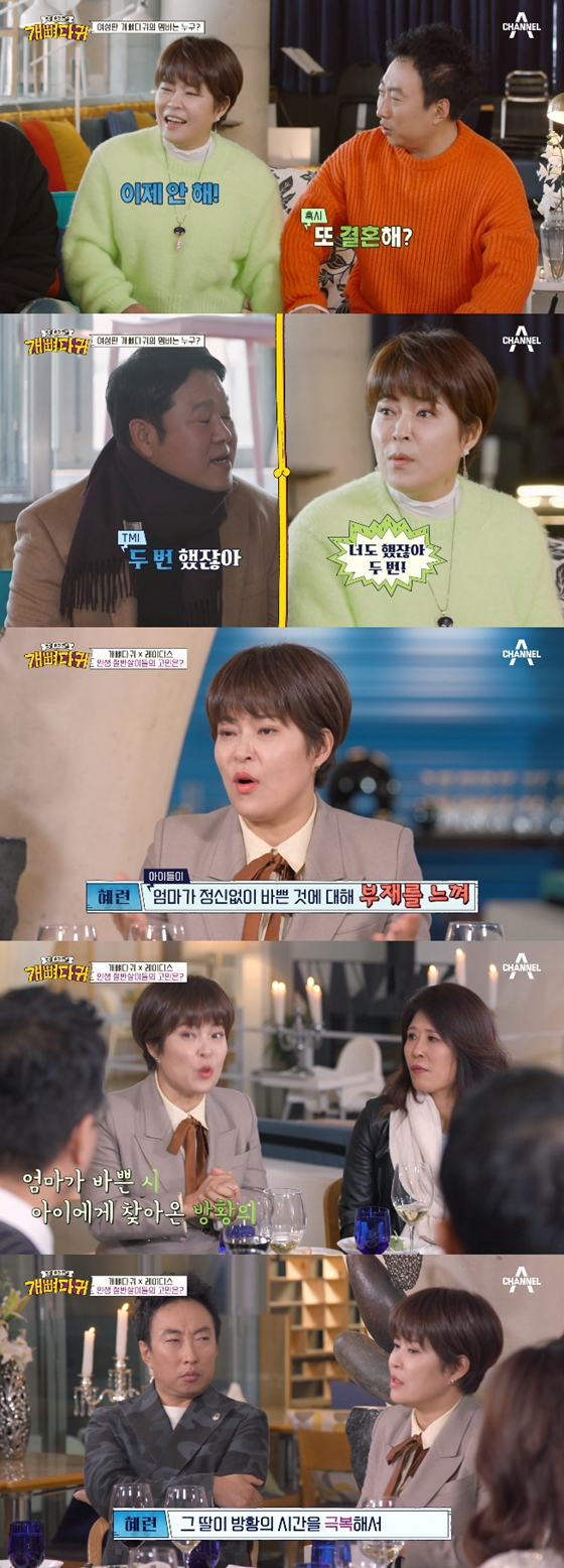 이날 조혜련은 본격적인 촬영을 앞두고 '개뼈다귀' 멤버들과 만났다. 이 과정에서 박명수가 "또 결혼해?"라고 묻자 "아니, 이제 안 해"라고 말했다. 또한 김구라가 "두 번 했잖아"라고 하자 "너도 했잖아. 두 번"이라고 응수했다. 조혜련은 1999년 김 모씨와 결혼, 이후 2012년 이혼했다. 또 2014년 재혼한 것으로 알려졌다.