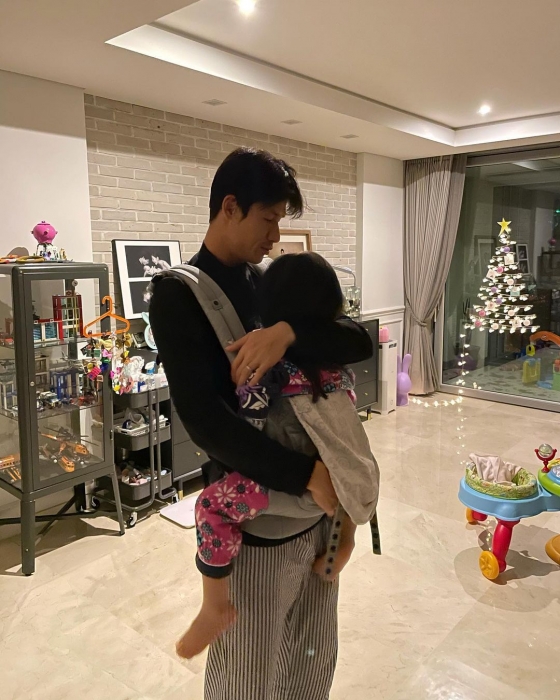 공개된 사진 속 정조국은 아기 띠를 매고 딸을 안고 재워 부성애를 보여줬다.