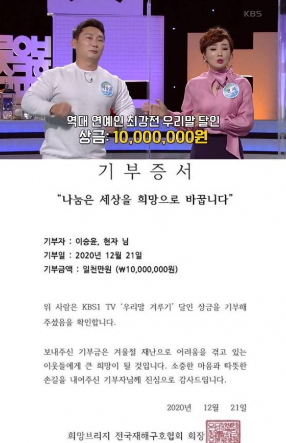 해당 사진은 이승윤, 현자 이름으로 희망브리지 전국재해구호협회에 1000만원을 기부한 기부증서.