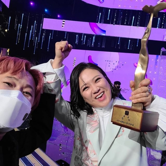 이어 그는 "거리두기 시상식이라 상을 미리받고 수상소감을 생방으로 지켜보는 재밌는 경험이기도 했지만 숙이도 저도 KBS출신이라 뭔가 오늘의 상이 더 뜻깊게 다가오네요. 감사합니다!"라고 전했다. 이날 송은이 역시 '2020 KBS 연예대상'에서 프로듀서 특별상을 수상하는 기쁨을 맞이했다.