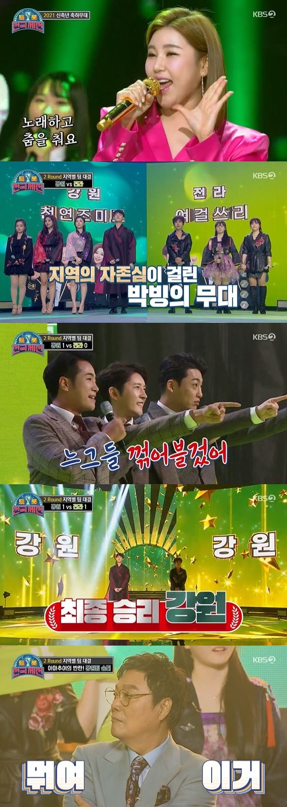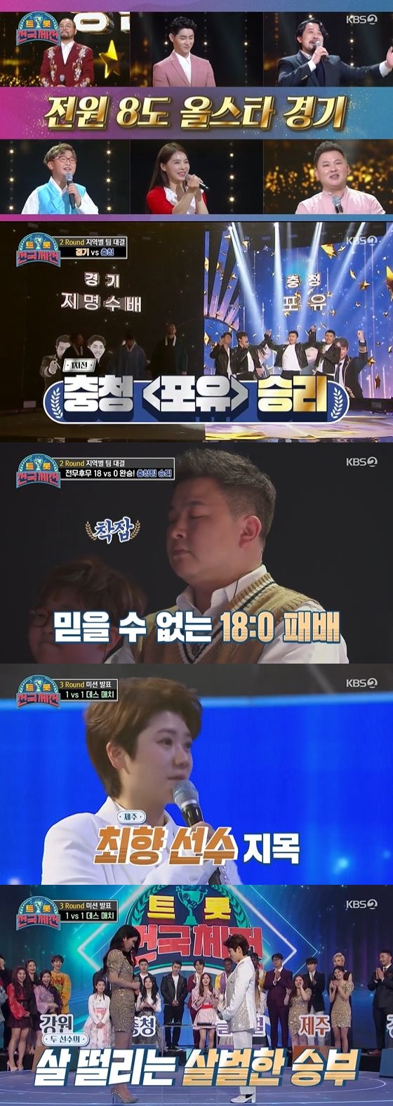 2일 방송된 KBS 2TV 예능프로그램 '트롯 전국체전'에서는 더욱 치열해진 지역별 팀대결이 펼쳐졌다.