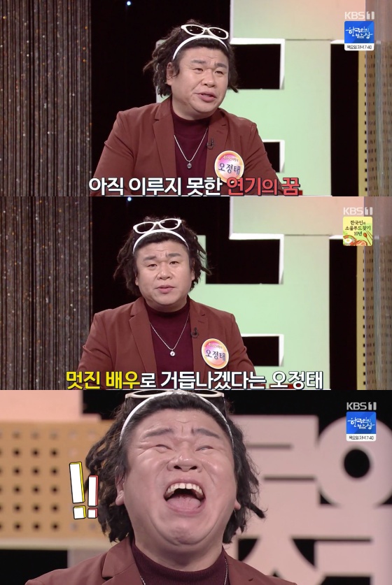 이날 MC 김선근이 오정태에게 올해 목표를 묻자 오정태는 "원래 개그맨 하기 전에 연극배우였다. 근데 연기에 대한 꿈을 못 이뤘다. 올해 영화가 들어왔다. 영화 '범죄도시'의 윤계상처럼 악역 연기를 해서 기억에 남는 배우가 되고 싶다"고 말했다.