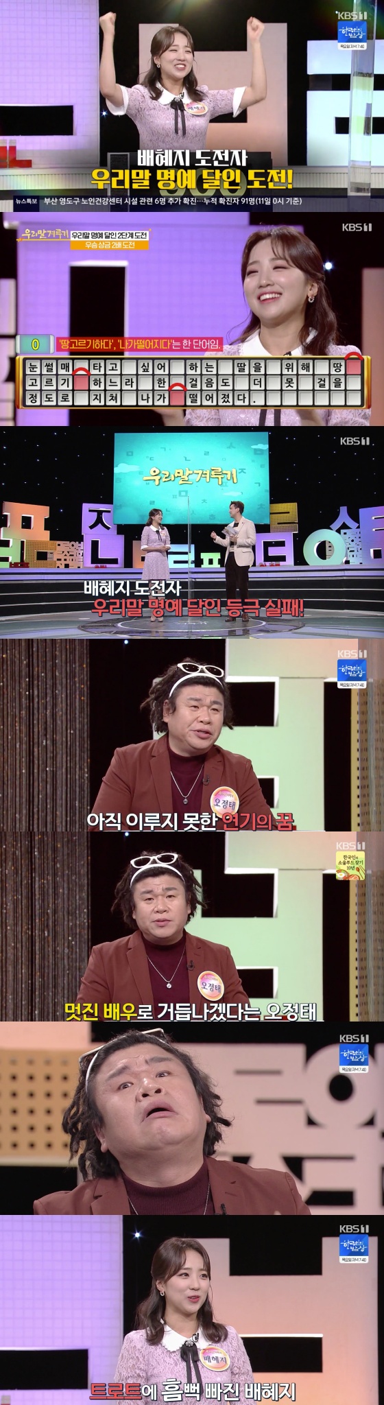 11일 오후 방송된 KBS 1TV 시사교양 프로그램 '우리말 겨루기'에는 코미디언 오정태, 기상캐스터 배혜지, 가수 구한나, 이현승을 출연해 정답을 맞히는 장면이 담겼다.