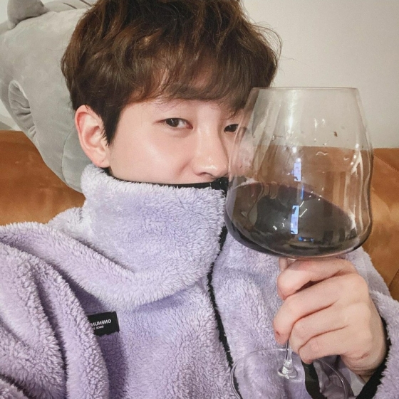 사진 속 딘딘은 편안한 차림으로 와인잔을 들고 있다. 살짝 풀린 눈과 발그레한 얼굴은 취기가 올라 상황에 심취한 딘딘을 보여준다.