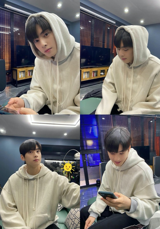 사진 속 차은우는 휴대폰을 보고 있다. 곧 차은우는 미소를 지으며 휴대폰으로 뭘 하는지 궁금증을 유발했다.