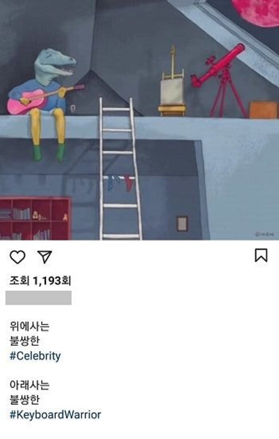 조인빈은 18일 자신의 인스타그램에 "위에 사는 불쌍한 #Celebrity 아래 사는 불쌍한 #KeyboardWarrior"라는 설명과 글과 함께 짧은 영상을 게재했다. 해당 영상에는 2층에서 기타를 연주하는 공룡의 모습이 담겨있다.