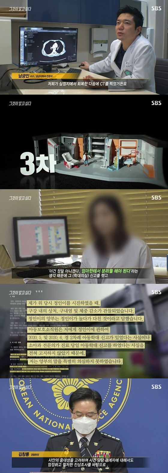 정인이를 구할 수 있던 마지막 '3차 신고'에 대해 심층 취재가 이어졌다. 당시 신고를 했던 전문의는 "입안에 상처가 있었는데, 엄마한테서 분리해야겠다는 생각으로 신고를 했다"고 밝혔다.