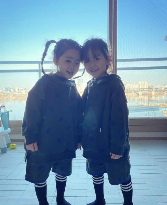 사진 속에는 같은 옷을 입고 머리를 맞댄 쌍둥이의 모습이 담겨있다. 엄마를 닮은 큰 눈이 시선을 모은다.