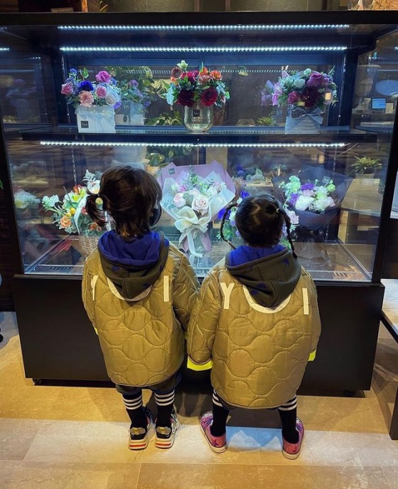 또 다른 사진 속에는 꽃을 바라보는 쌍둥이의 모습이 담겨있다. 동글동글한 뒤통수가 보는 이들을 미소 짓게 만든다.
