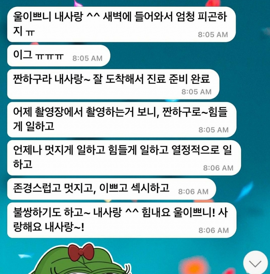 사진 속에는 한창이 장영란에게 보낸 응원 메시지가 담겨있다. 한창은 "우리 예쁘니 내 사랑. 새벽에 들어와서 엄청 피곤하지", "어제 촬영장에서 촬영하는 거 보니 짠하구려. 힘들게 일하고 언제나 멋지게 일하고 힘들게 일하고 열정적으로 일하고 존경스럽고 멋지고, 예쁘고 섹시하고 불쌍하기도 하고. 내 사랑 힘내요"라며 장영란에게 애정을 표현했다.