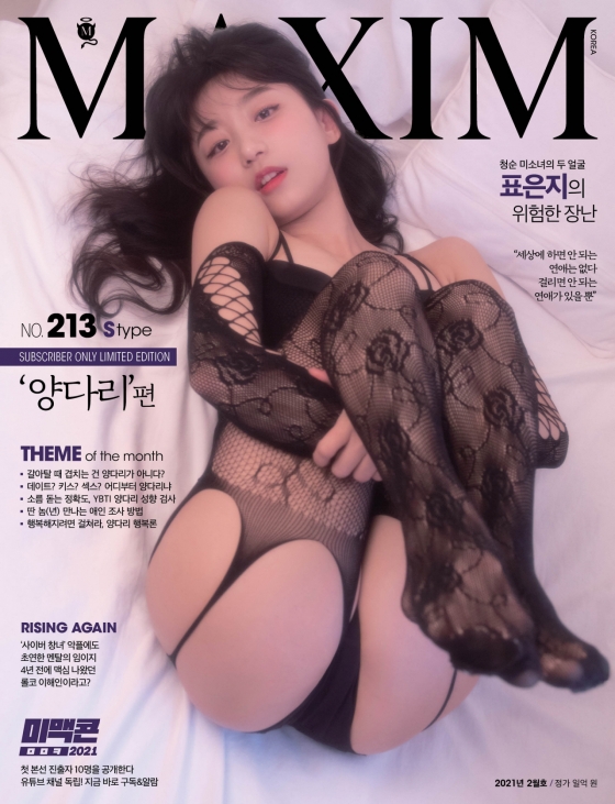 남성지 맥심(MAXIM)이 인기 모델 표은지의 파격적인 정기구독자용 한정판 표지를 공개했다. 2021년 2월호 한정판 맥심 표지에서 표은지는 블랙 전신 망사 스타킹을 신고 있다.