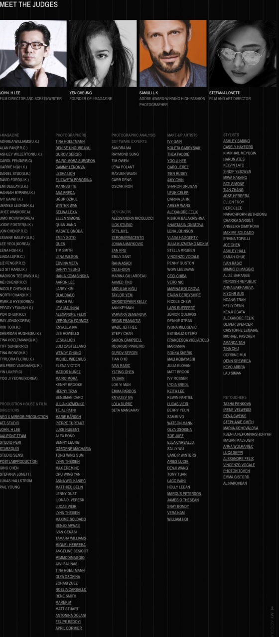 올해로 5회째를 맞는 I-MAGAZINE FASHION FACE AWARD는 영화감독 이재한 (John H Lee), 아시아 영화 투자자 I-MAGAZINE잡지 창간자 Yen Cheung, 어도비 수상 사진작가 SAMULI.L.K, 럭셔리 브랜드 아트 디렉터 STEFANIA LONETTI, ADOBE BEHANCE의 주요 아티스트와 파트너십을 유지하고 ADOBE의 지능형 얼굴 인식 소프트웨어를 사용해 6개 부문에서 최고의 패션 페이스를 선정했다.