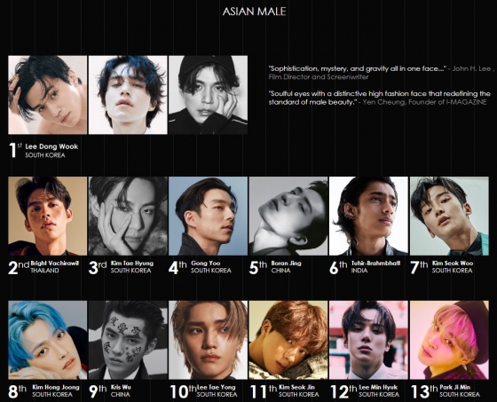 아시아 남자부문 1위는 배우 이동욱이 차지했고, 3위 방탄소년단의 뷔, 4위 배우 공유, 7위 SF9 로운, 8위 에이티즈(ATEEZ) 홍중(8위), 10위 NCT 태용, 11위 방탄소년단 진, 12위 몬스타엑스 민혁, 13위 방탄소년단 지민이 차지했다.