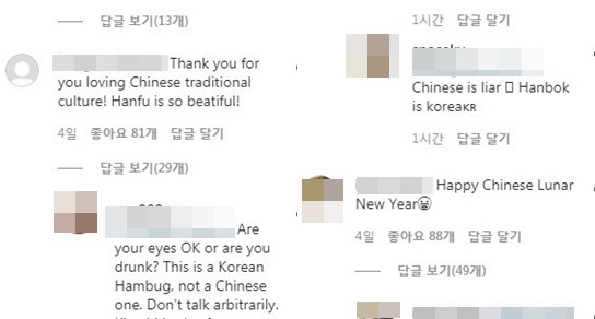 또 다른 네티즌들은 "이건 한국 전통이 아닌 중국 전통 의상"이라며 억지 주장을 펼치는가 하면, "행복한 중국 설 보내세요"(Happy Chinese Lunar New Year)라는 댓글을 쏟아내기도 했다.