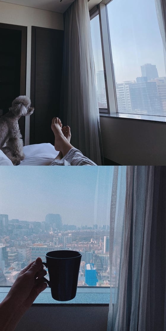 공개된 사진 속에는 호텔에서 생활 중인 김준희의 모습이 담겨있다. 창밖으로 보이는 도심 속 풍경과 반려견과의 평화로운 일상이 눈길을 끈다.