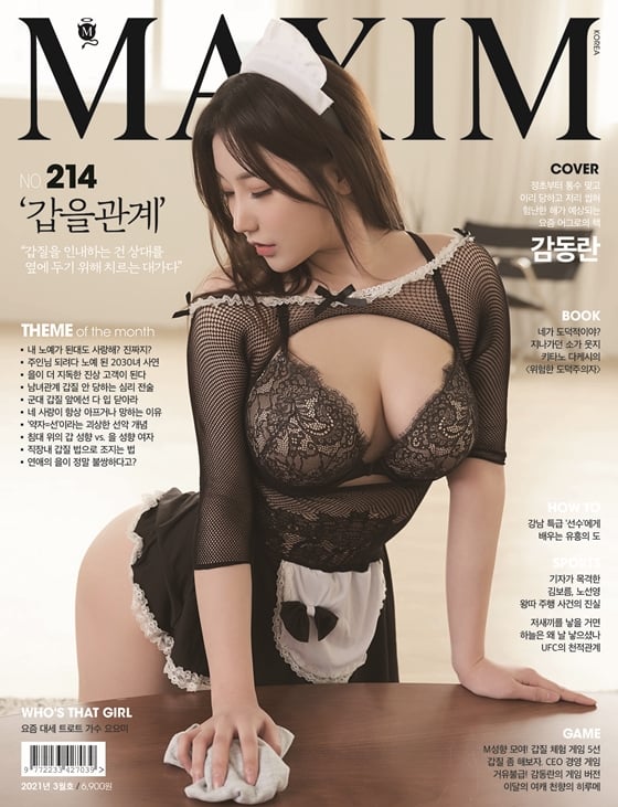 '갑을관계'를 주제로 한 통권 214호 맥심 표지 모델로 나선 감동란은 오피스룩에 과감한 란제리를 매칭한 '도발적인 직장 상사' 콘셉트와 편안한 홈웨어와 메이드 복으로 연출한 '나만의 여자 친구' 콘셉트를 차례로 소화하며 반전 매력녀를 연기했다.