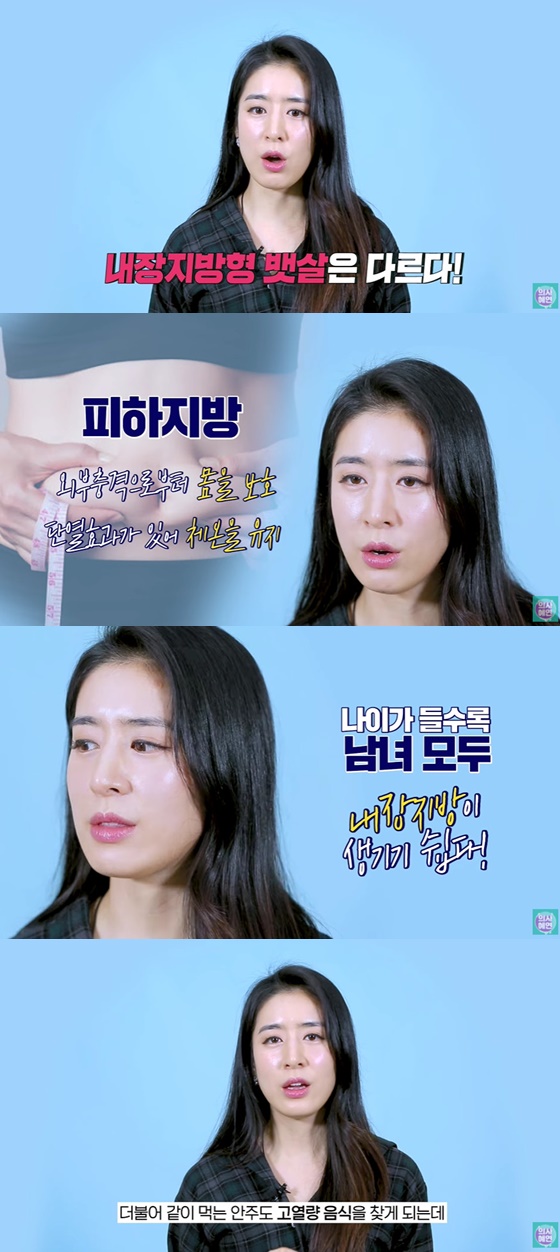 민혜연은 피하지방형 뱃살에 대해 먼저 설명했다. 그는 "뱃살 중에서도 피하지방이 제일 늦게 빠진다고 보면 된다. 내장 지방은 살을 뺄 때 유산소 운동을 하거나 전반적인 체중 감량이 되면 같이 빠진다. 피하지방의 목적은 복강 내 장기를 보호하기 위한 것이다. 몸에서 만들어질 때도 적당량의 뱃살은 반드시 필요하다고 구성돼 있기 때문에 가급적이면 빠지지 않고 유지하려고 프로그래밍돼 있다"고 설명했다.